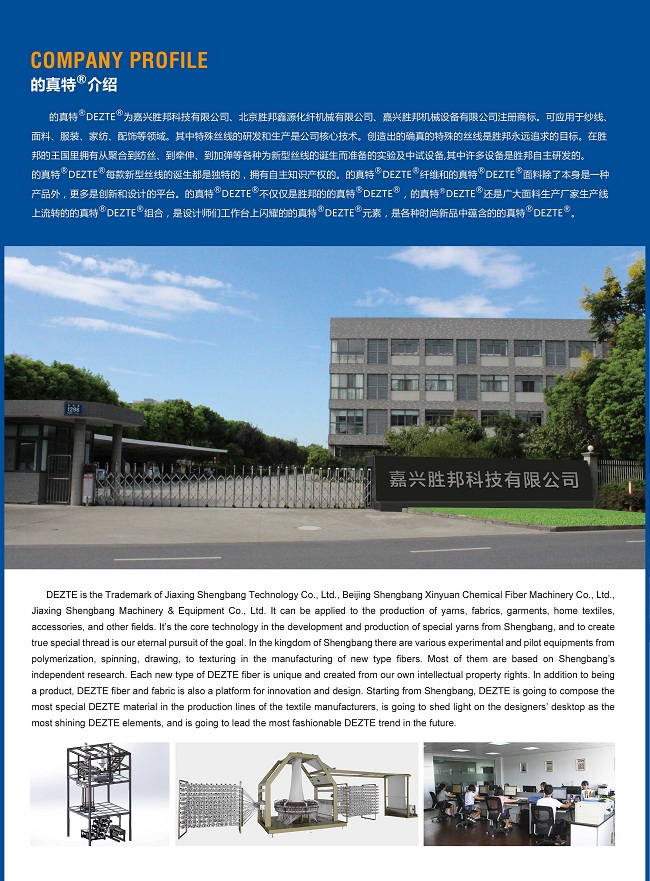 無(wú)論圓機(jī)、橫機(jī)、各種梭織機(jī)、經(jīng)編機(jī)均可適用,節(jié)部分精確可控,批號(hào)恒定,100%重現(xiàn),而且可以按客戶、設(shè)計(jì)師要求精確確定節(jié)的大小、排列方式、吸色程度。“的真特”滌綸竹節(jié)絲“節(jié)”部分的剛性、柔性及結(jié)晶度可精確控制,且單絲至0.3d的長(zhǎng)絲勝邦都可以做出竹節(jié)。